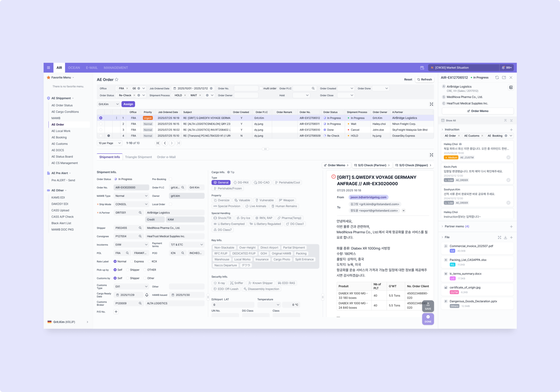 오더에 연결된 이메일 내역을 한눈에 파악해 맥락을 놓치지 않고 대응할 수 있습니다.
